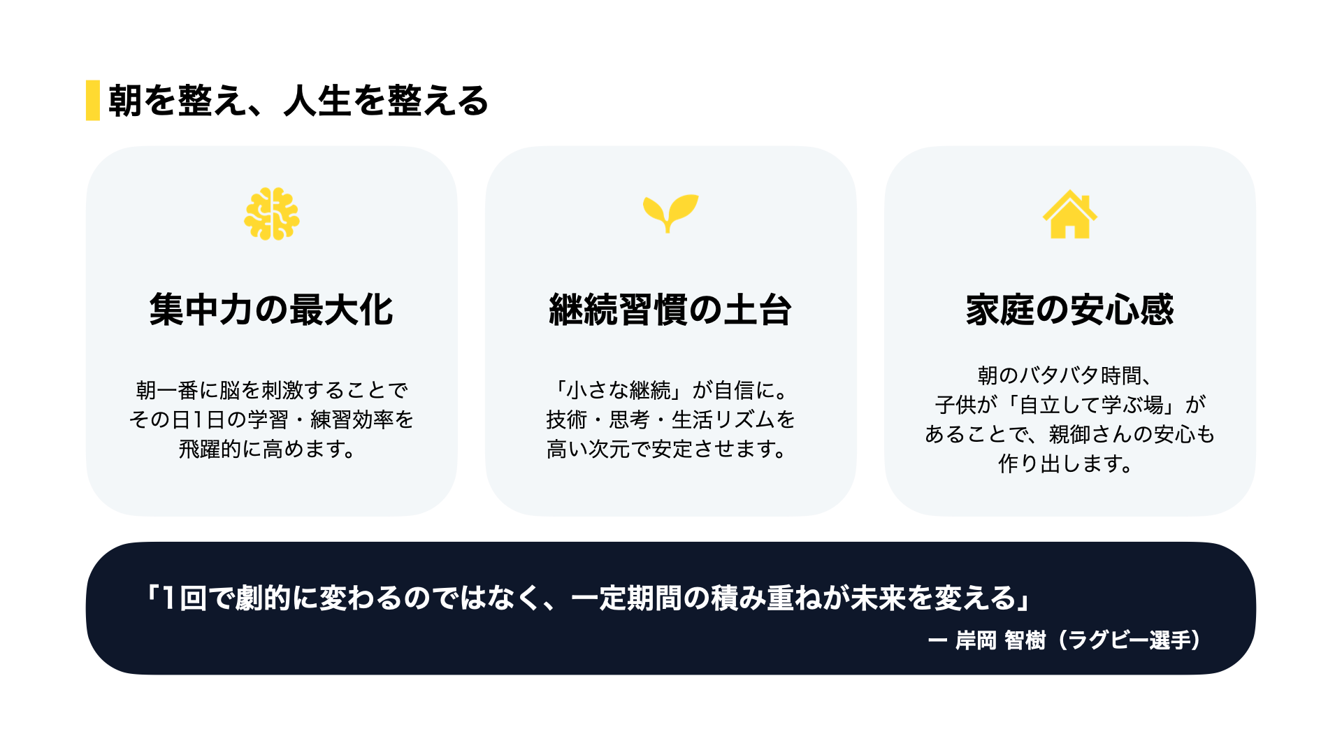 テーマ例:目標設定、文武両道、集中力、セルフ・リフレクション、リーダーシップなど