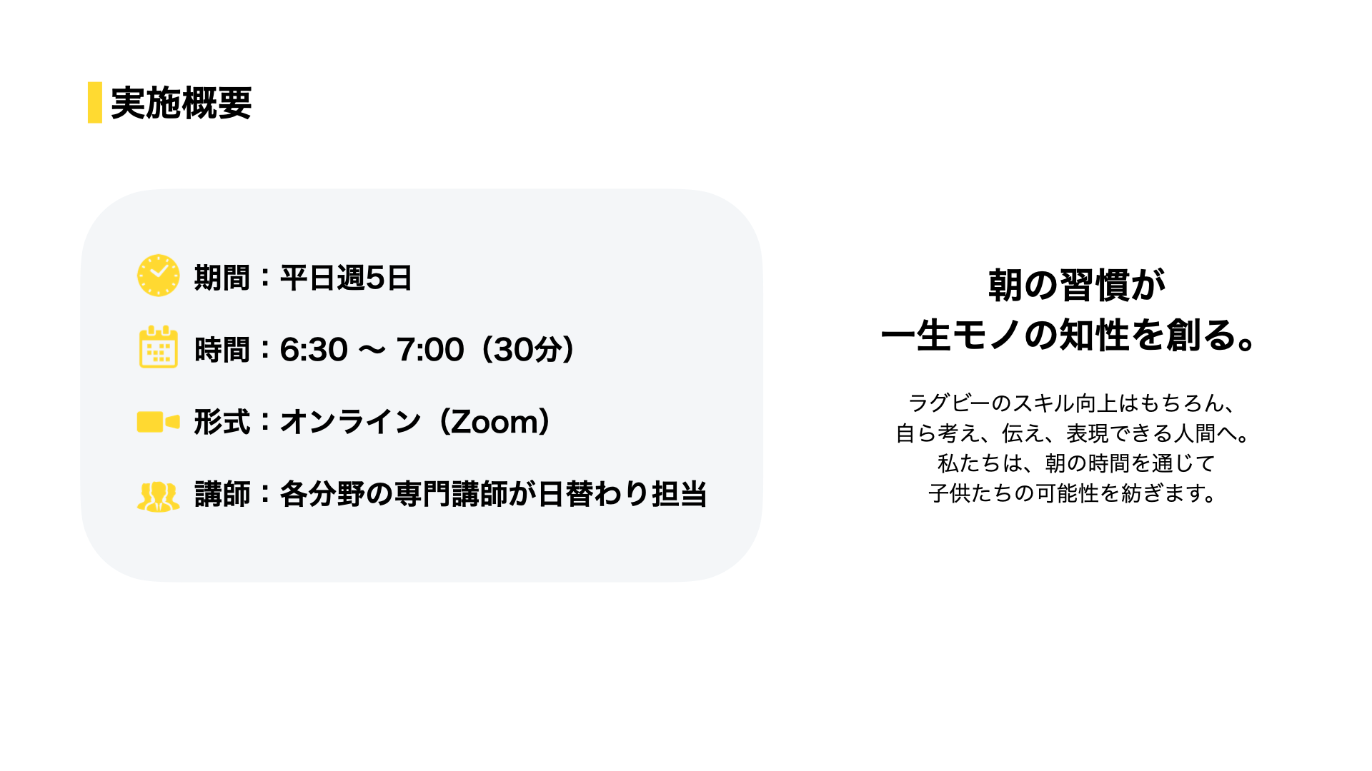 充実した内容、レベルの高い学びだが小中学生に理解しやすく、伝えたり意見に共感していただけている。一方的な受け身でない、皆参加出来るところが良いと思います。継続して参加していくなかで本人がラグビーに取り組む中で、学んだ事がいかされてると思う場面が多々あります。